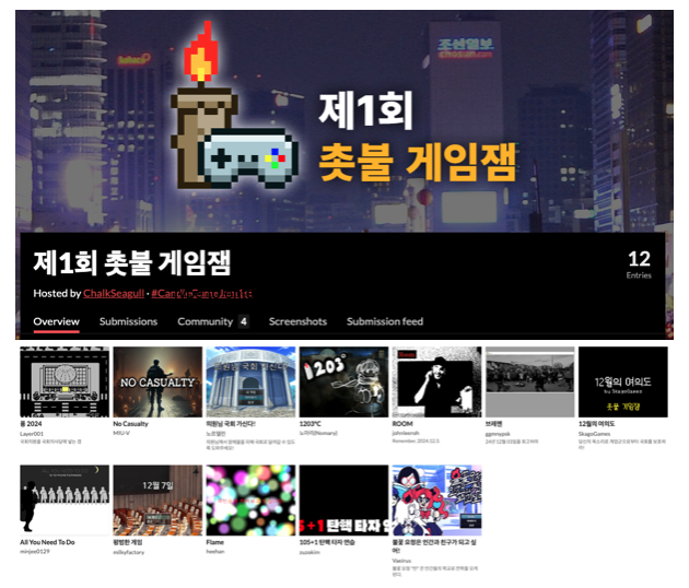 The first movement by developers was expressed through organized game jams as well as individual development projects. Developer Chalkseagull organized a Game Jam to memorialize the chaotic events surrounding the collective boycotting of the impeachment vote, the deployment of military and police forces to the National Assembly, and the declaration of an unconstitutional martial law. The game jam resulted in 12 submissions, with developers gathering in Yeouido Park on December 14th, the day of the impeachment vote, to collaboratively develop and play these games amidst protestors calling for justice. While not all the games were Newsgames, many sought to capture the moment creatively, using genres like roguelikes and narrative-driven games to explore and express the unfolding crisis. These games sparked discussions among players, with many expressing that the satirical themes provided a sense of catharsis, amidst the political tension.